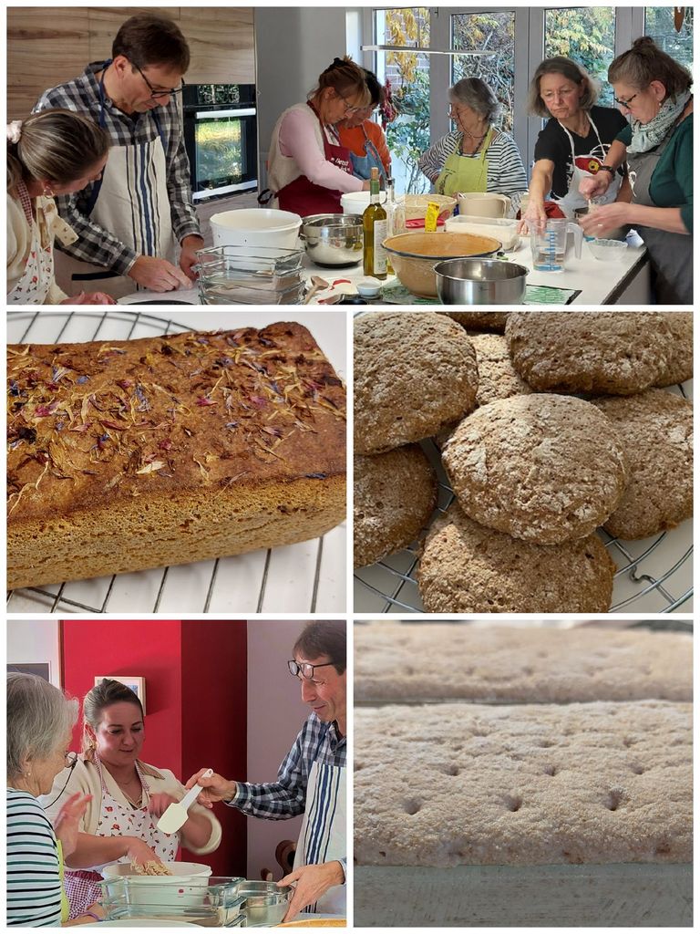 Nach zahlreichen Backtagen mit Hefeteig sind wir nun zum Sauerteig übergegangen. An bisher 5 Terminen konnten die TeilnehmerInnen des Kurses feststellen, dass Brot mit Sauerteig als Backtriebmittel gebacken dem Gebäck nochmal eine andere Geschmacksrichtung mit anderen Backeigenschaften gibt. Insbesondere beim Backen mit Sauerteig gelingen die Backwaren besser, wenn man einiges an Hintergrundwissen hat. Das wurde an diesem Kurstag fachkundig von Ute Olk vermittelt, aber auch der praktische Teil kam nicht zu kurz. Mit großem Engagement haben die TeilnehmerInnen Vinschgauer-Fladenbrötchen, Emmer Brötchen, Norddeutsches Schwarzbrot mit Emmer und Roggenvollkornbrot mit Dinkel gebacken.
